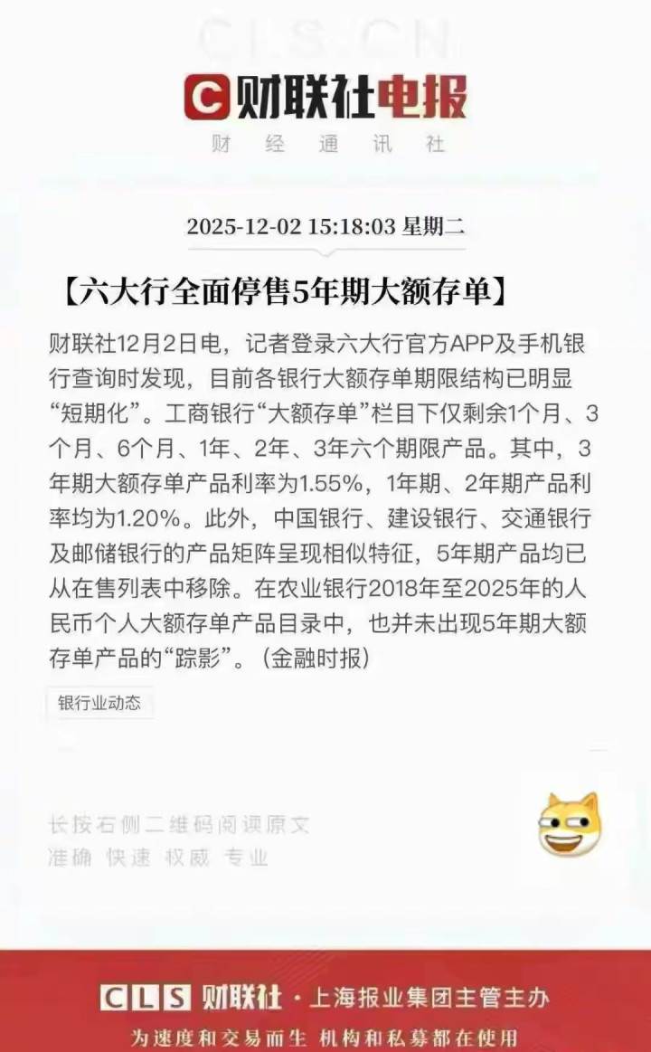 取钱是节略了,可想找高利息却变难了。你有莫得发现,五年期的大额存单越来越难找了?其实从2025年12月运行,好多大银行仍是暗暗停售这类居品。当今市面上多是三年期以内的,利率还降了,三年期也就1.55%摆布。为什么银行不爱卖永真切?说白了,当今商场利息低,银行怕当今欢跃了高利率,以后我方赚不到差价。那我们平庸东谈主奈何办?硬存五年不合算,万一急费钱,提前取出来利息可能只剩零头,10万块放两年提前取,利息才百来块,怜爱不?